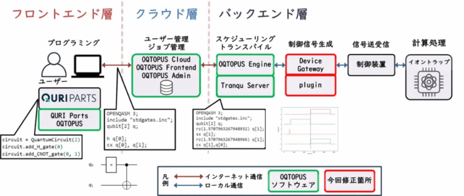 安定した長期的な遠隔利用を実現するため、本システムには自動イオンローディング、自動レーザー位置補正、継続的な状態監視といった不可欠な自動化技術が組み込まれています。この統合制御システムにより、研究者が装置に直接触れることなくイオン捕捉型量子ビットを維持することが可能となり、24時間稼働可能な量子コンピューティングプラットフォームへの道が開かれます。クラウド接続は、大阪大学QIQBで開発されたオープンソースソフトウェアプラットフォームであるOQTOPUS(Open Quantum Toolchain for Operators and Users)を使用して実現されています。